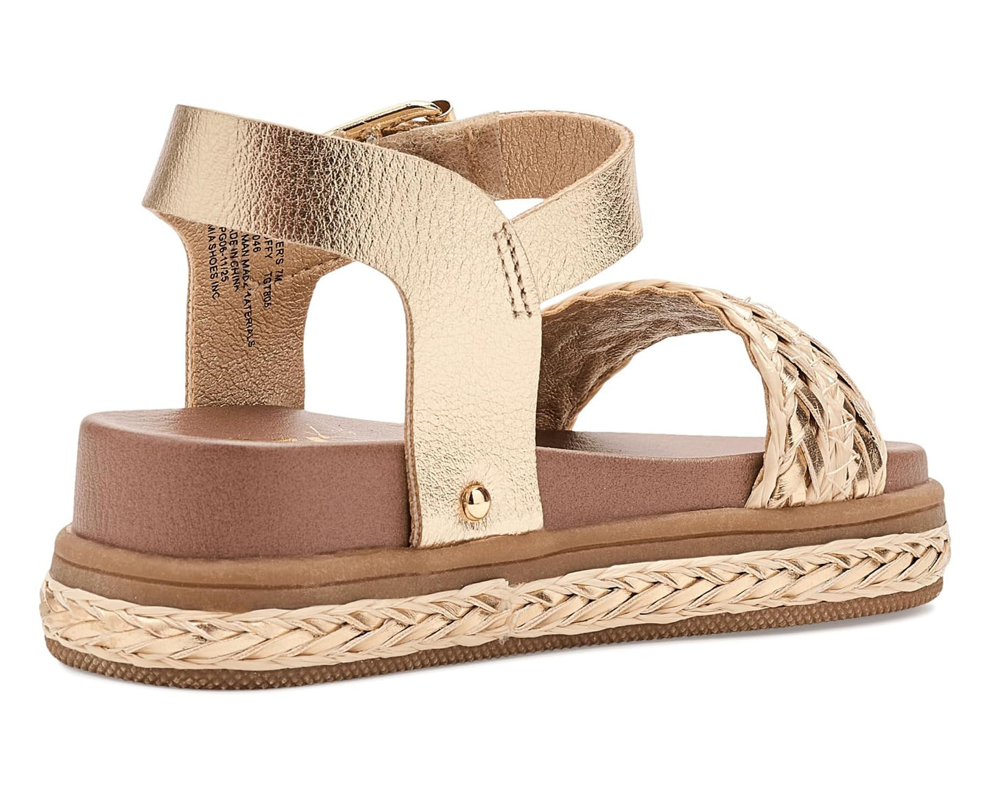 - Faux leather upper, lining, and burnished polyurethane or raffia insole.