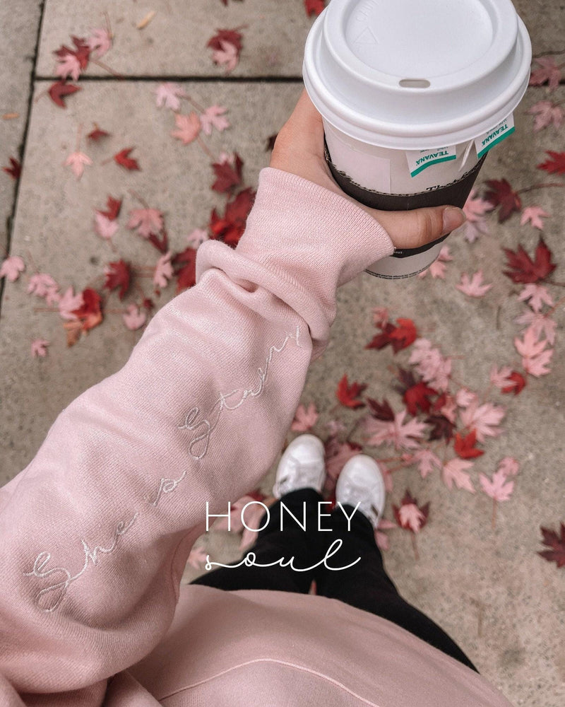 Embroidered Sleeve 'She is Strong' Sweatshirt in BLUSH PINK