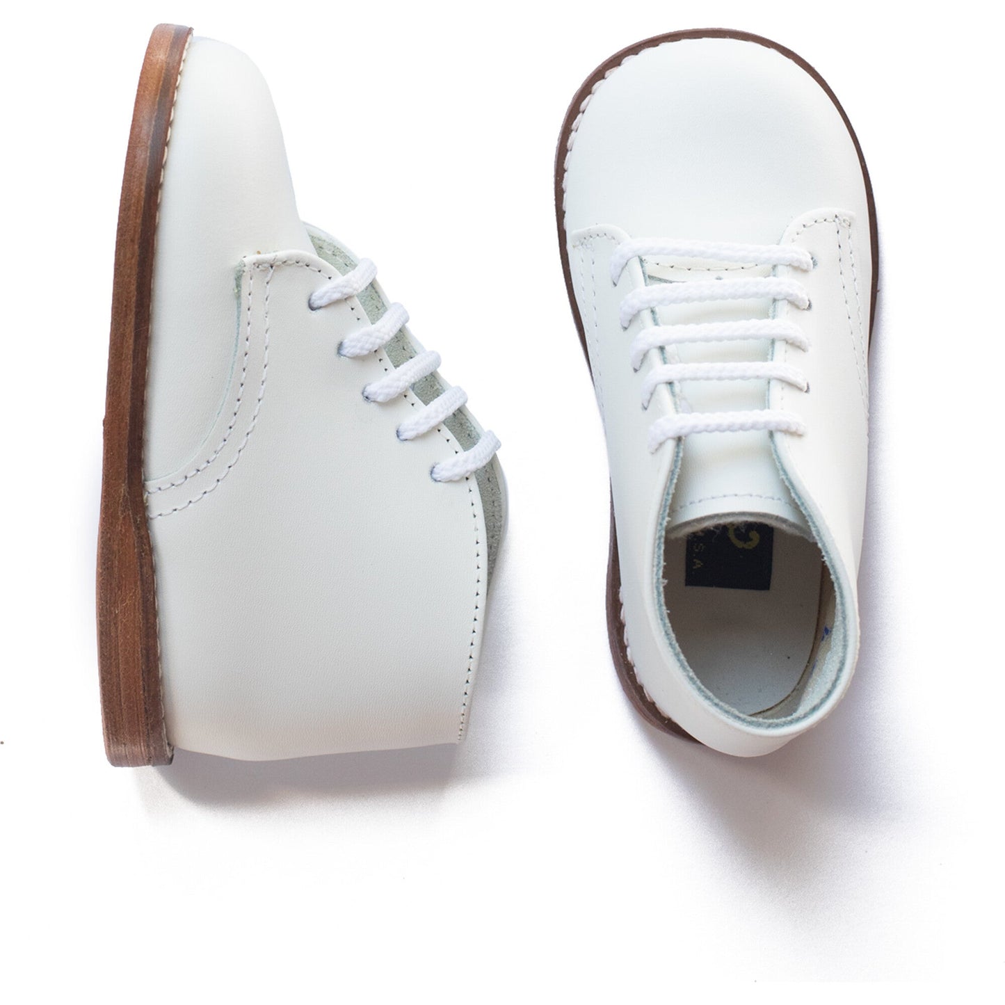 The White Smoothie II First Walker is made of white leather and lined with breathable leather and cotton which work together to draw out any moisture. The structure of the shoe and the flexible sole provide stability without weight to support your child's early steps.