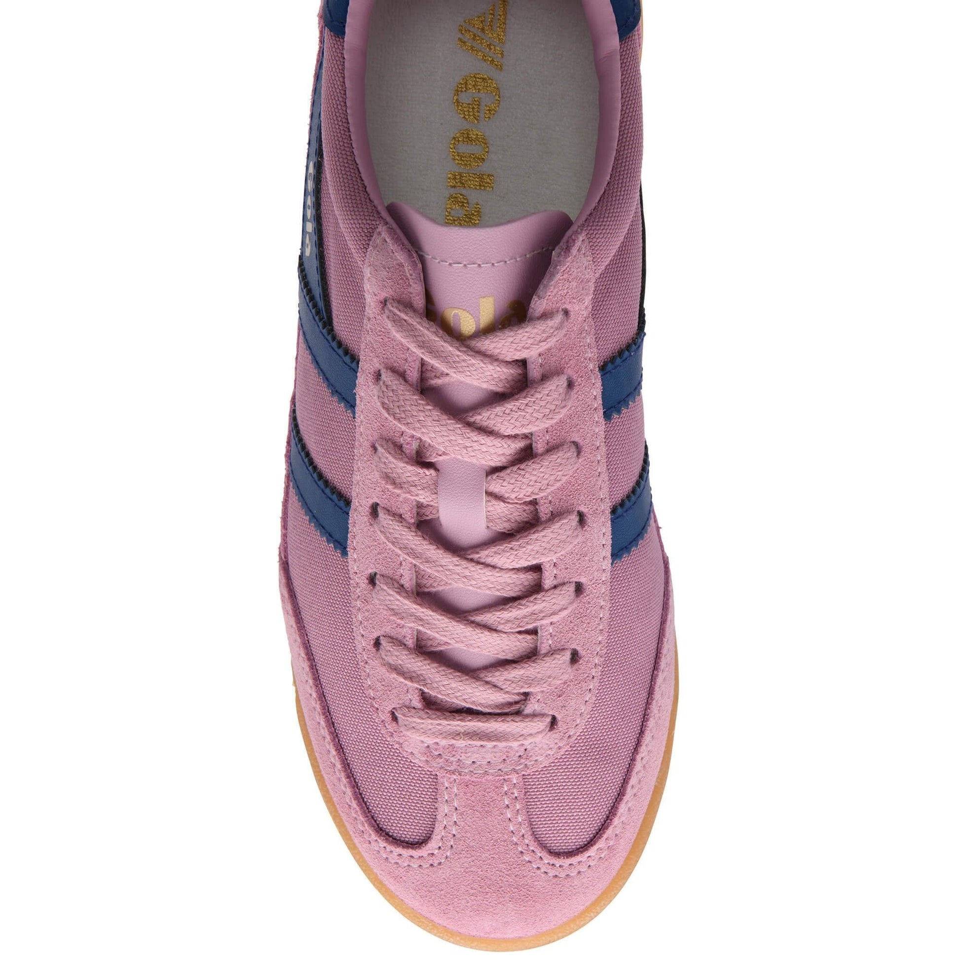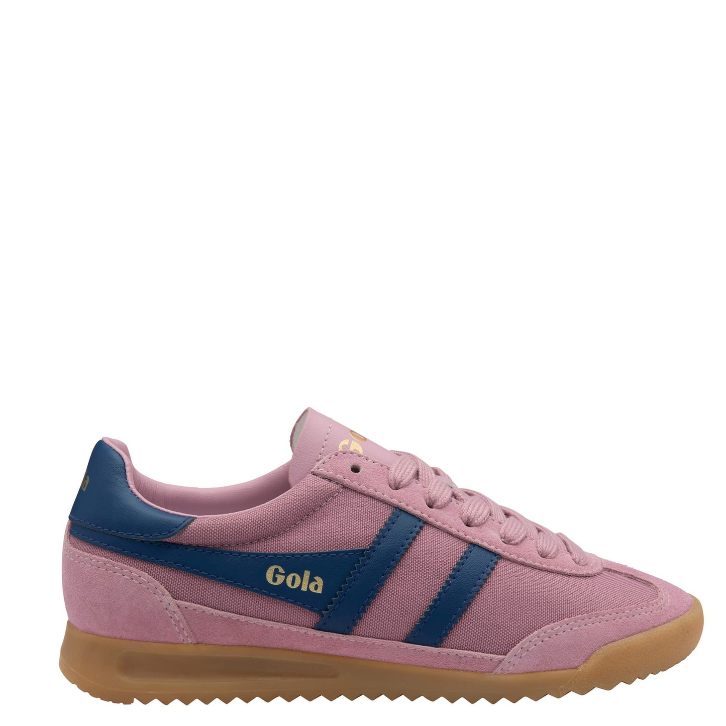 With much chatter on terrace influenced sneakers having their moment, Gola Tornado sweeps in at the speed that its name suggests. A heavy weave nylon upper in candy pink is complemented with matching suede trims to the toe, heel and lace facing and contrasted with a deep blue Gola wingflash side trim with sawtooth edges. Sat upon a slight wedge gum sole, Tornado for women offers the full old school sneaker package.